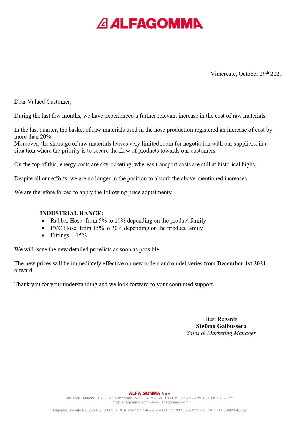 Повышение цен на продукцию Alfagomma